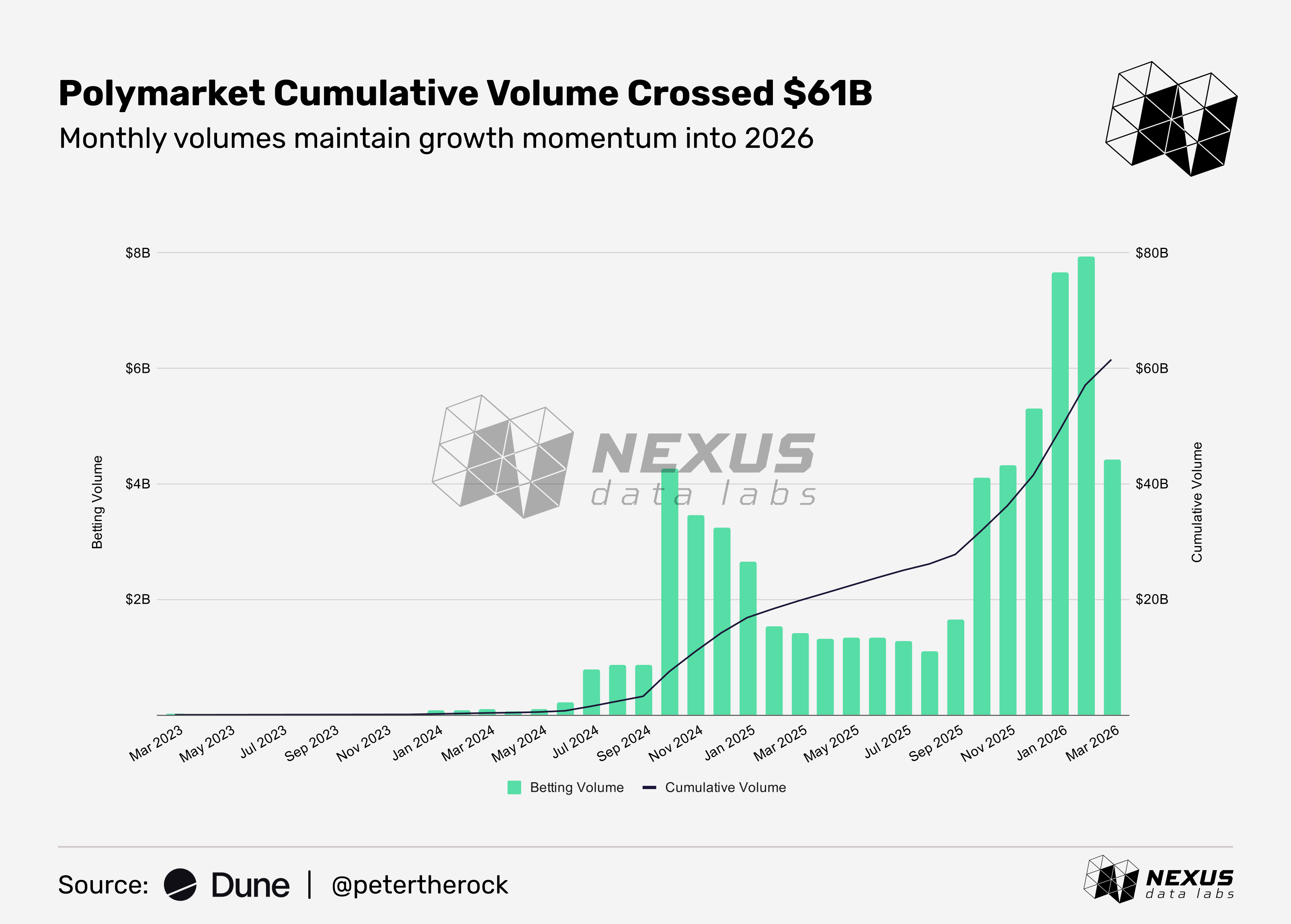 Polymarket continues to see accelerating growth across trading activity and trader capital. The platform has generated over $61B in cumulative trading volume. In February 2026, $7.94B was traded, up 3.7% from January's $7.66B. Participation is also rising, with 80.7M bets placed in February, up 55% from 52M in January.