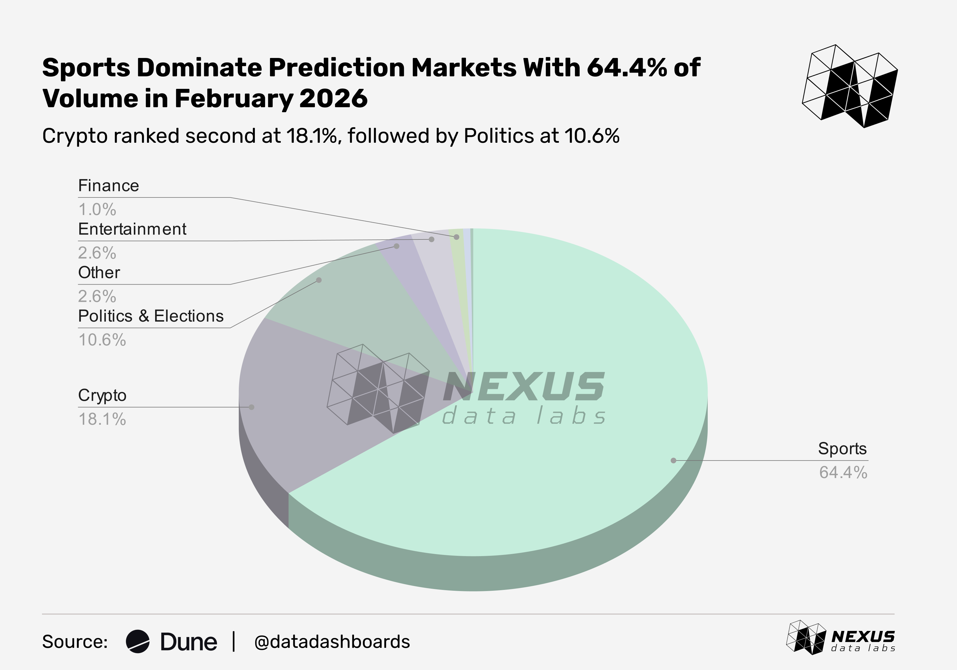 Across Polymarket and Kalshi, sports led category share at 64.4%, followed by crypto at 18.1% and politics at 10.6% as of February 2026. This is largely driven by Kalshi's aggressive expansion into sports event contracts. Polymarket's mix is more balanced across crypto, politics, and entertainment.