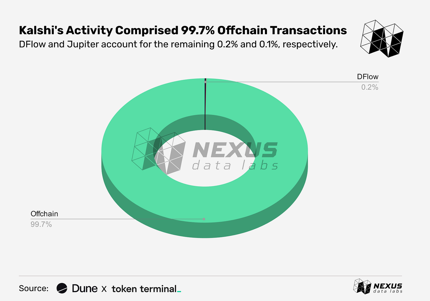 It is worth noting that while Polymarket and Kalshi currently dominate the space by volume, Nexus focuses exclusively on blockchain-based activity. Coverage is scoped to Kalshi's onchain activity and its partnership with DFlow, which provides tokenization infra for prediction markets.