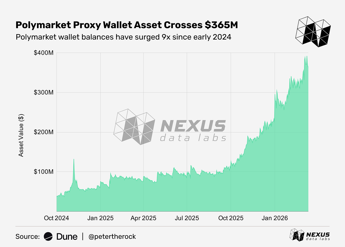 Trader capital has expanded alongside activity. As of February 2026, approximately $336M is held across Polymarket proxy wallets, up from $37M in October 2024, representing over 9x growth in 16 months.