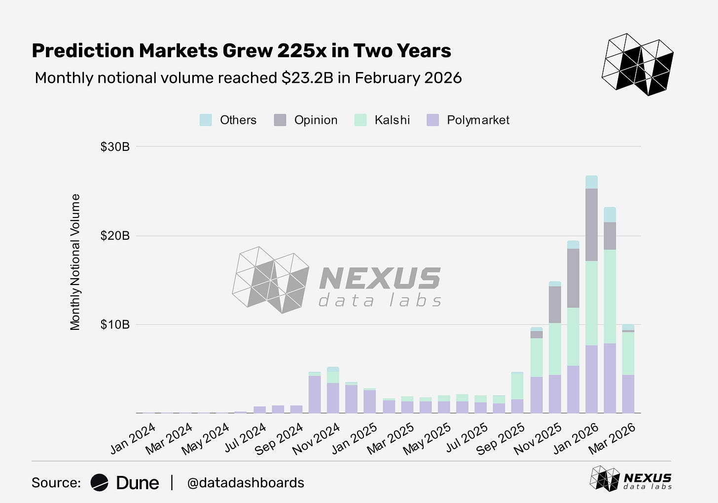 The prediction market sector grew 225x in two years, from $103M to $23.2B in monthly volume.