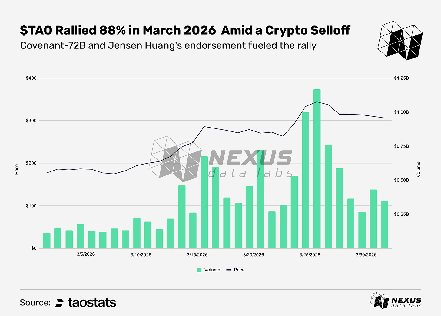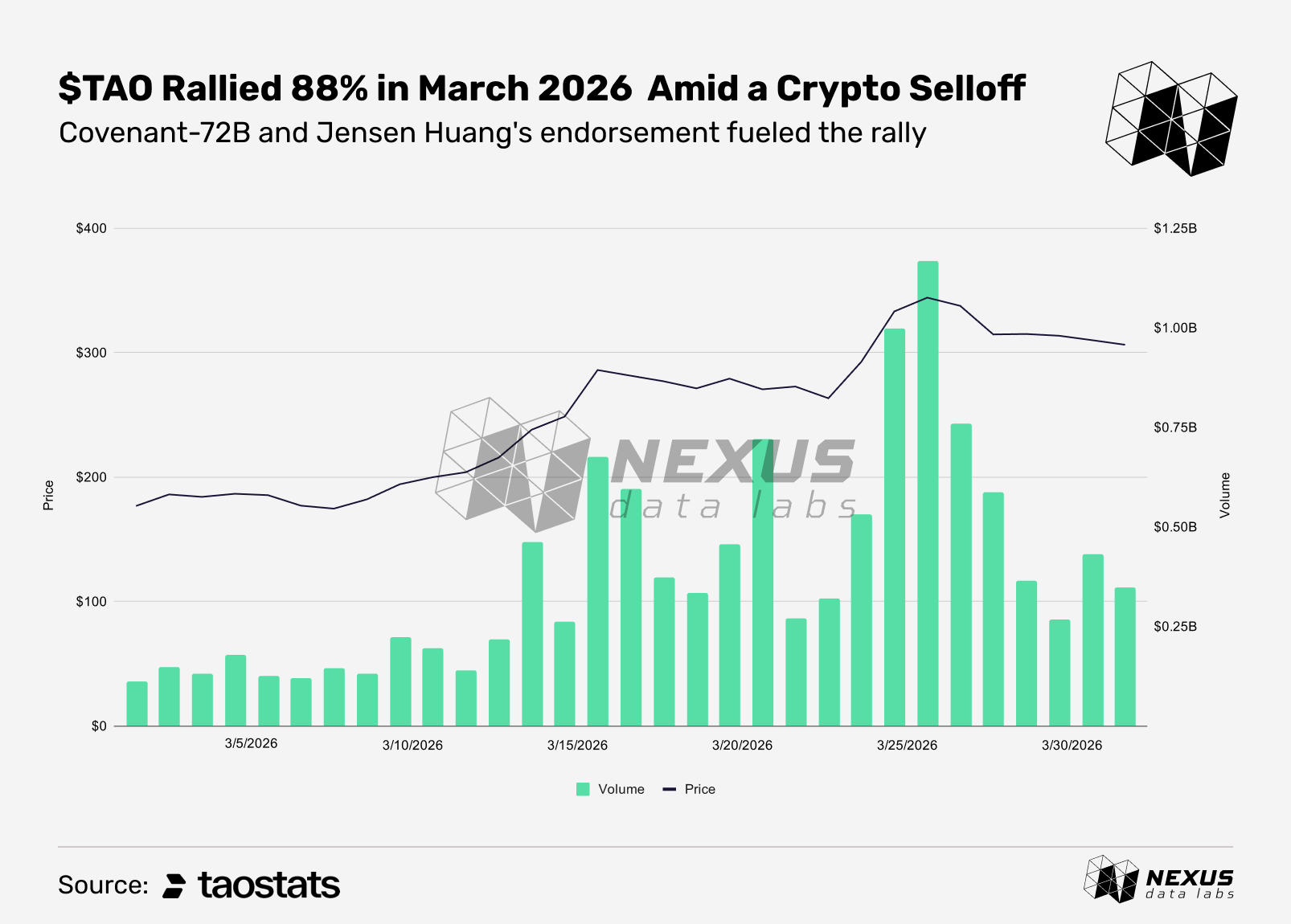 $TAO rallied 88% in March 2026 as Covenant-72B validated decentralized AI training at scale