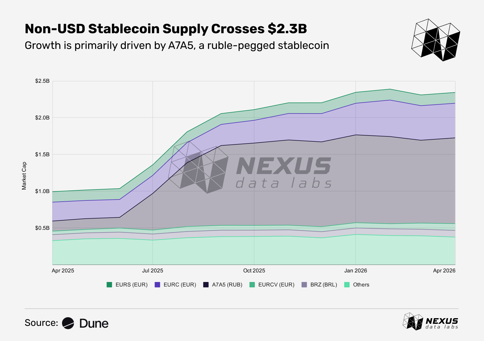 According to Dune, non-USD stablecoin supply has crossed $2.3B, expanding 2.3x in 12 months. But the distribution behind that number is uneven, and the headline figure obscures a fragmented picture beneath it.