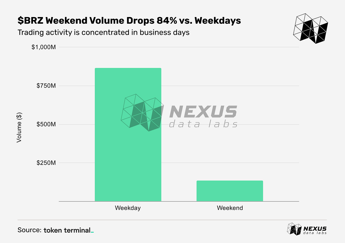 On average, BRZ transfer volume drops 84% on weekends compared to weekdays. The average weekday sits around $14.7M while weekends come in at $3.4M. That pattern is a direct signal of payment orientation, consistent with payroll and B2B settlement cycles rather than speculative trading. Usage is leading supply growth, not the other way around. That is what a local-currency stablecoin functioning as a real payment tool looks like.