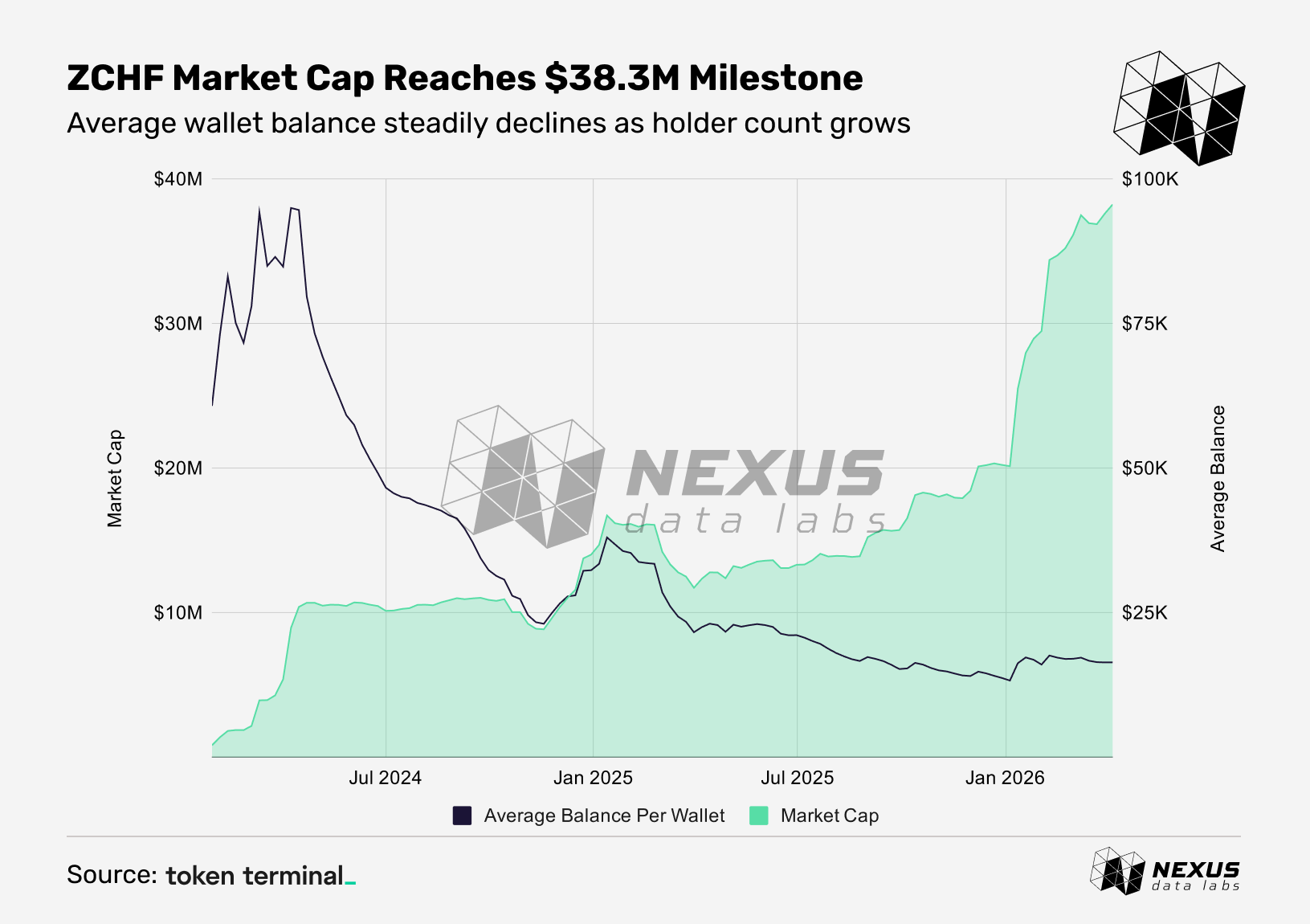 ZCHF's market cap reached $38M while average wallet balance declined from roughly $90K to under $25K. Early data suggests organic adoption may be broadening beyond the protocol's early users, though it is too soon to draw firm conclusions. Average balance alone captures only one dimension of that distribution. Growing market cap paired with an expanding holder base will determine whether ZCHF's trajectory reflects structural demand or remains a niche footnote in the stablecoin market. Until that scale is reached, ZCHF remains a proof of concept rather than a functioning alternative to dollar-based stablecoins.