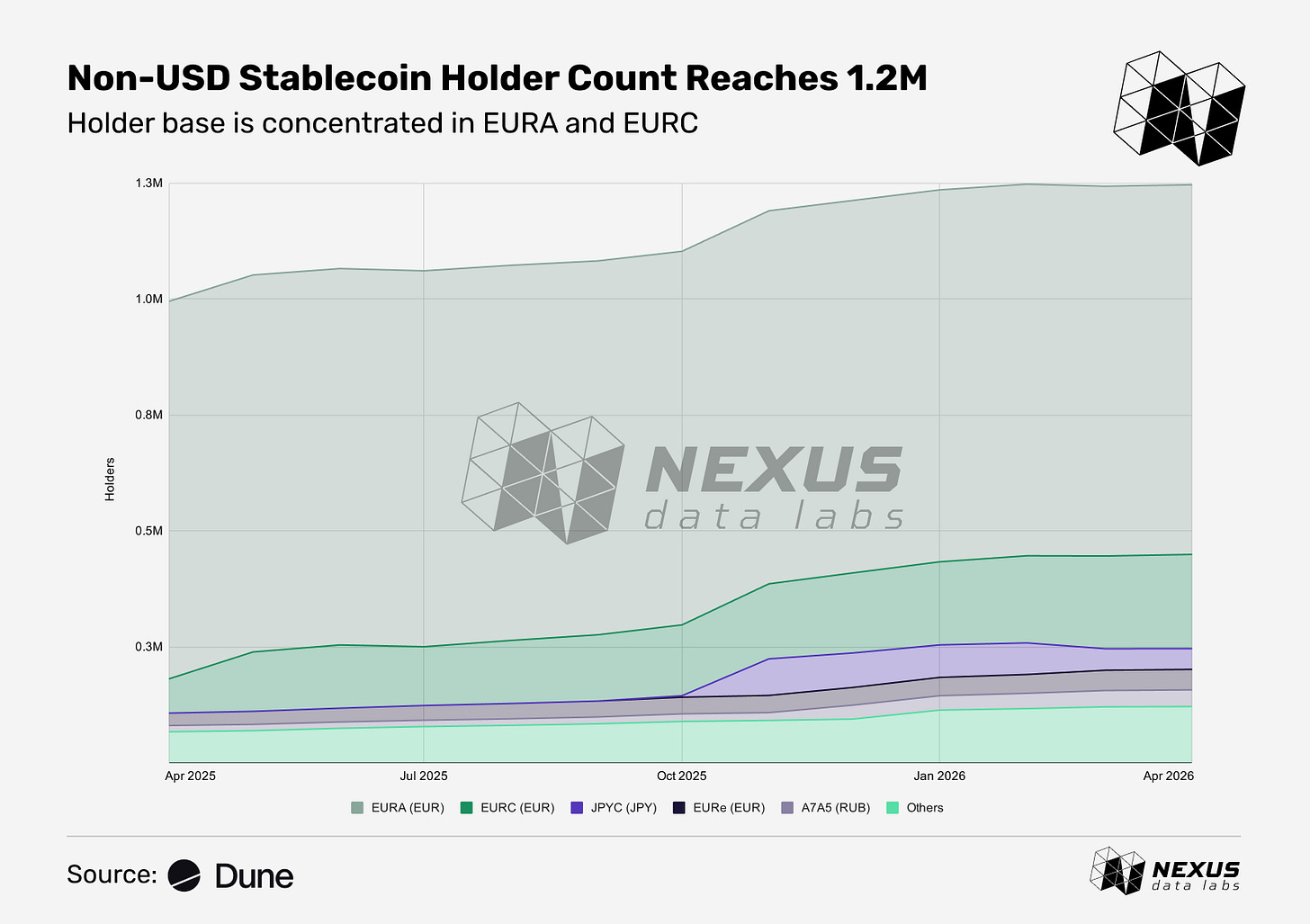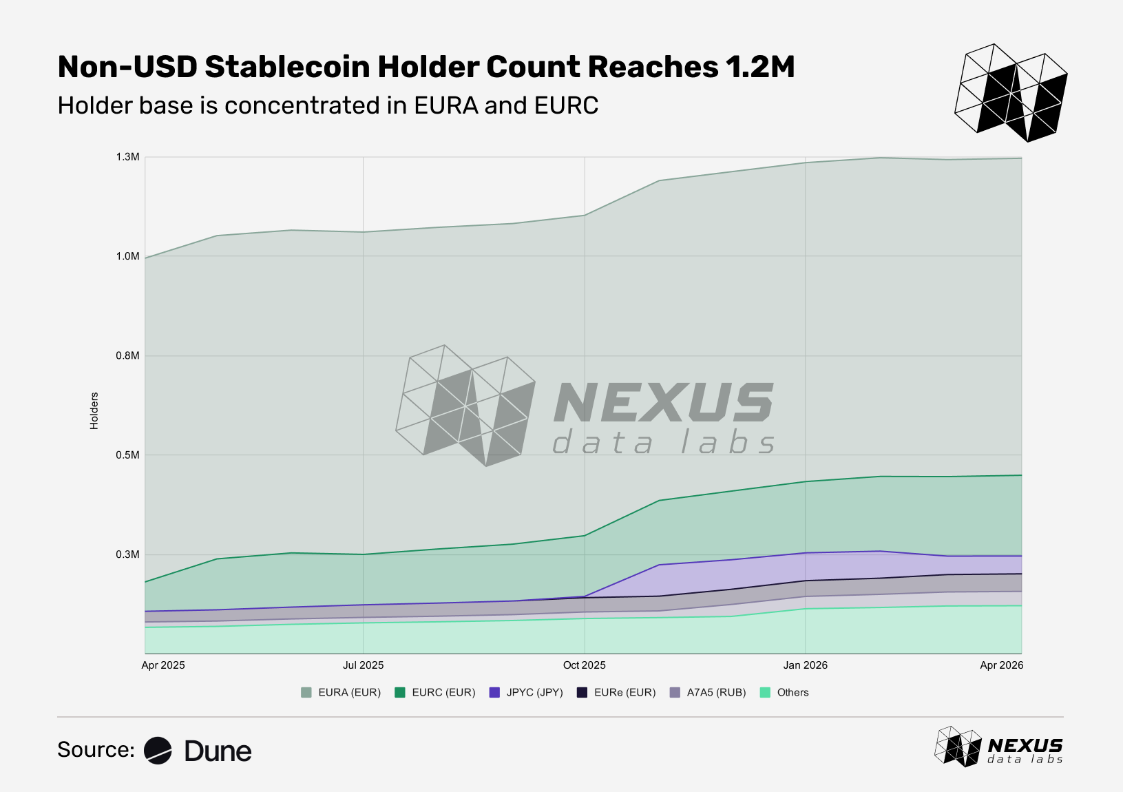 Euro-pegged stablecoins remain the most diverse category by both supply and holder count. But across the broader non-USD landscape, supply growth and holder growth are moving at different speeds and in different directions.