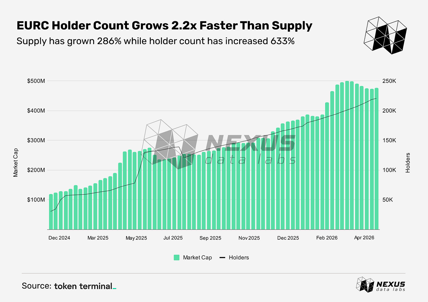 Since January 2025, supply has grown 286% while holder count climbed 633%, with holders growing 2.2x faster than supply. One interpretation is that EURC is becoming diluted as new holders enter. Each holder represents a proportionally smaller share of total supply than 16 months ago, even as overall supply has expanded. That pattern is consistent with organic adoption rather than concentration.