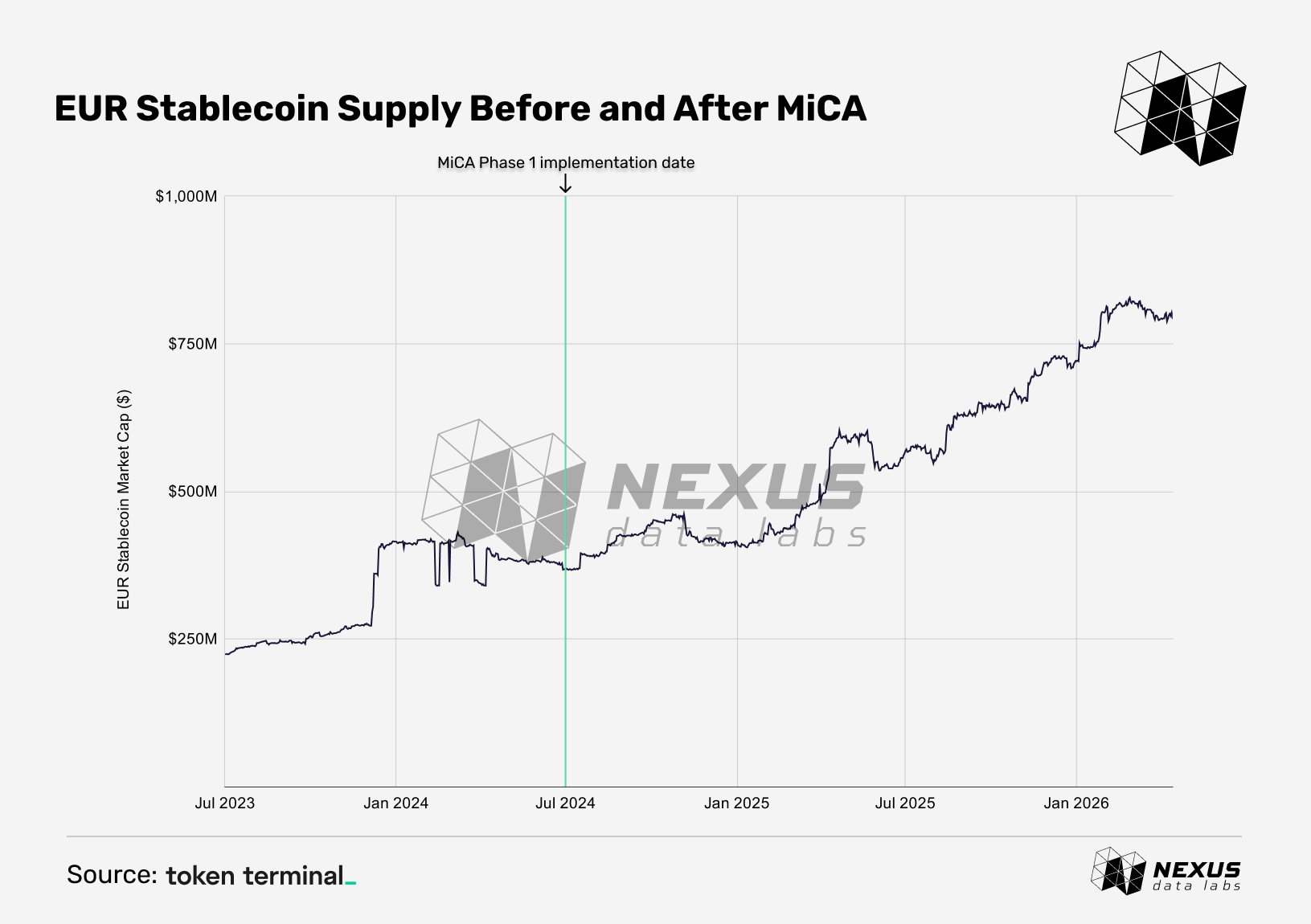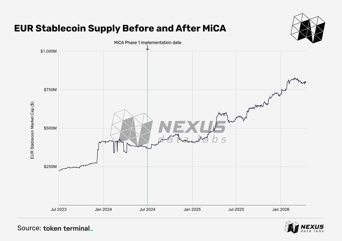 Circle’s EURC became the first MiCA-licensed euro stablecoin in July 2024. Post-MiCA, EURC volumes increased 1,139% and Societe Generale’s EURCV volumes rose 343%. Building on that momentum, a consortium of 12 European banks, including ING, UniCredit, BNP Paribas, and BBVA, formed Qivalis to launch a MiCA-compliant euro stablecoin in H2 2026.