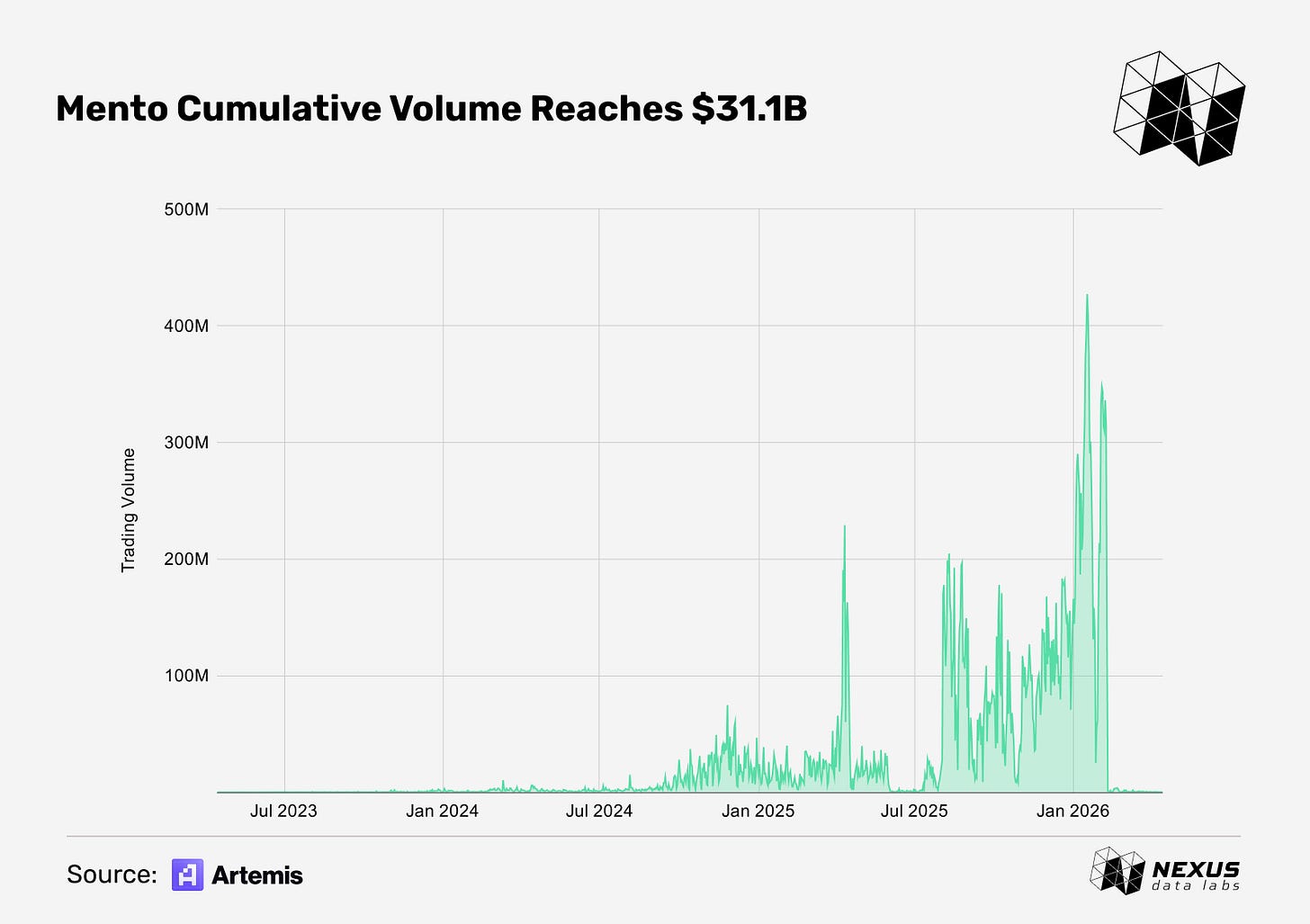 That model already exists in early form. Mento’s Fixed-Price Market Maker (FPMM) prices swaps against oracle-fed real-world FX reference rates rather than pool dynamics, eliminating the impermanent loss problem that makes traditional AMMs uneconomical for stablecoin LPs. Mento has processed $31B in cumulative DEX volume across 15 currency pairs, according to Artemis.