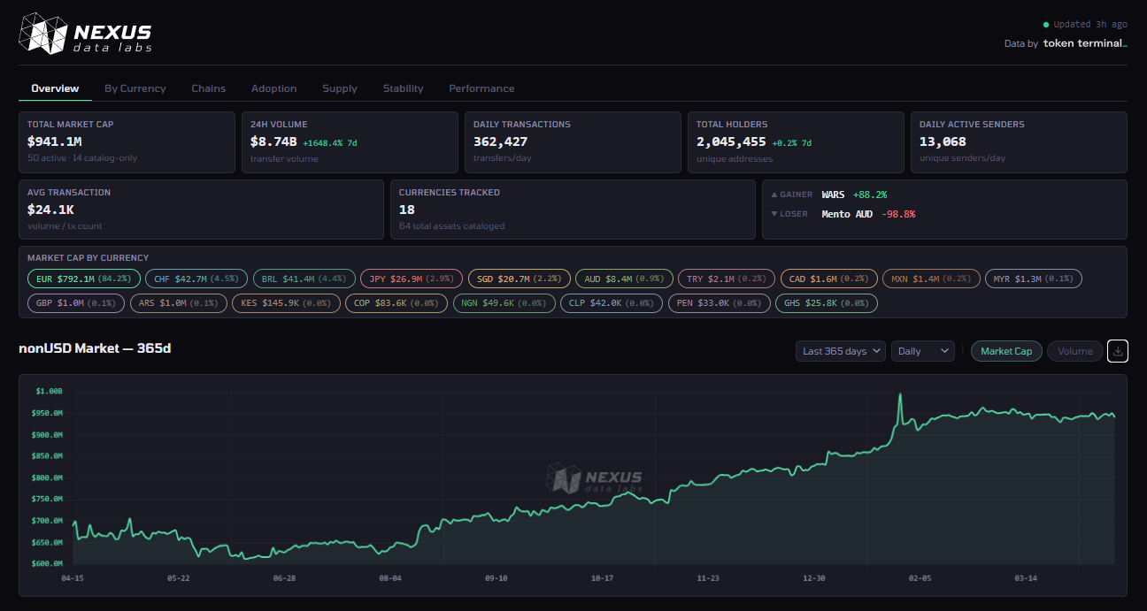 Nexus is building Non-USD Stablecoin Dashboard, powered by Token Terminal, tracking issuance and activity across non-USD denominated stablecoins. The dashboard is a work in progress, and we welcome feedback as we continue to refine it.